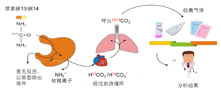 幽门螺杆菌可以产生尿素酶,会将碳-14尿素分解为含有碳-14的二氧化碳,通过肺排出。